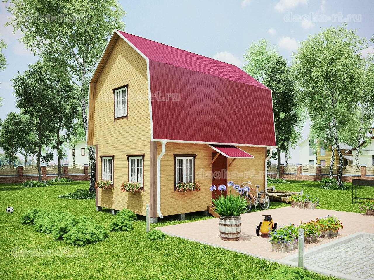 В базовую комплектацию включаются следующие опции: фундамент - опорно-блочный из бетонных блоков 200*200*400мм, наружная обшивка дома - вагонка хвойных пород; пол - шпунтованная доска 36*135мм; окна - размером 800*1000мм двухстворчатые с фурнитурой; двери - филенчатые; кровля - ондулин черепица (цвета на выбор); Проект каркасного дачного дома можно видоизменить, добавить террасу, веранду, или балкон (для вариантов домов с мансардной крышей)